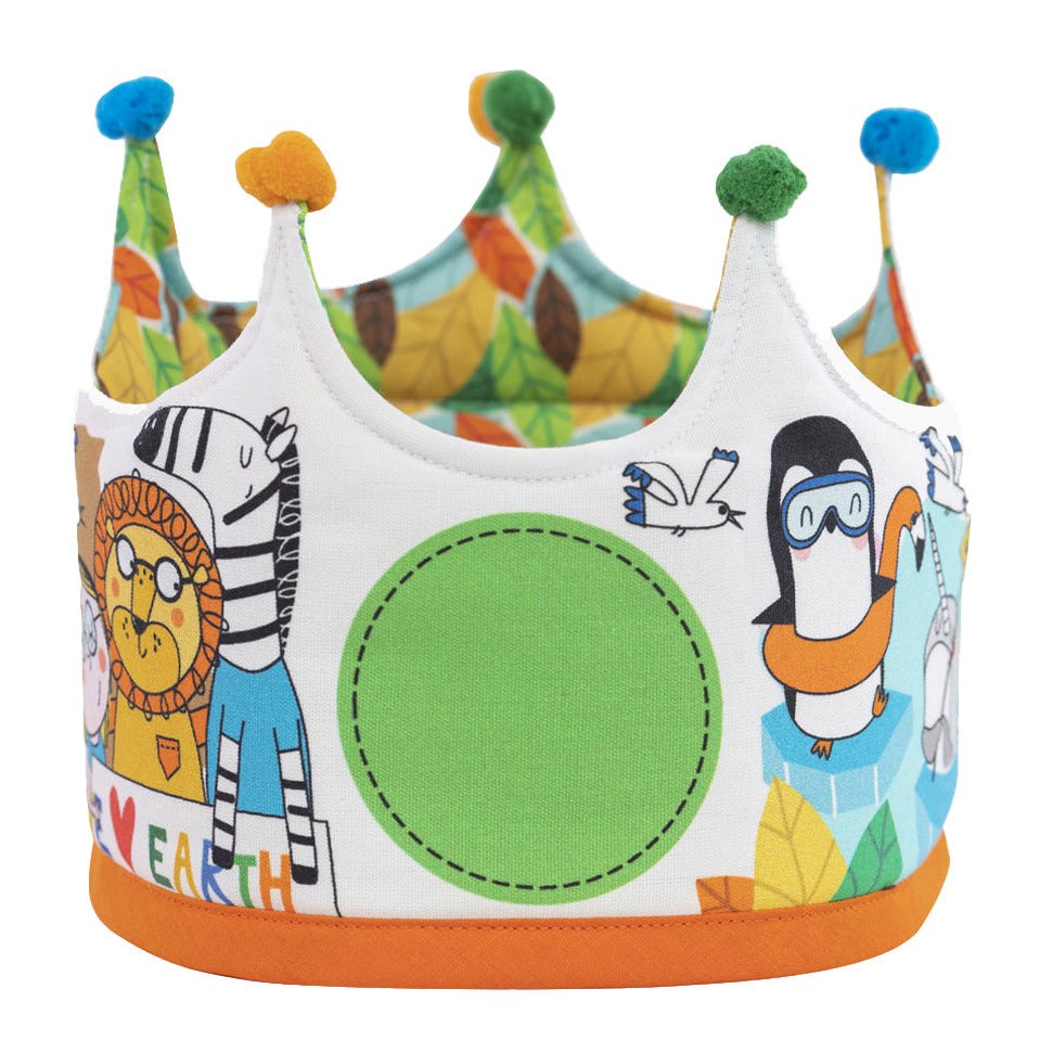 Original y divertida corona de cumpleaños reversible para celebrar la fiesta de tu hijo. Con un bonito print de nuestros personajes de la colección la Tierra. Apliques de borlas de colores. Redonda de fieltro para enmarcar el número (del 0 al 9). Acolchada para mayor comodidad y cierre ajustable de velcro. La caja de presentación no tiene desperdicio.