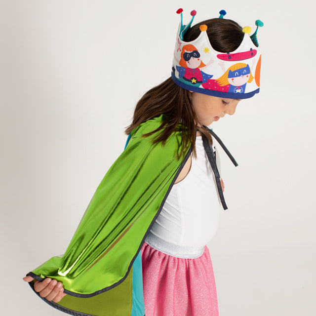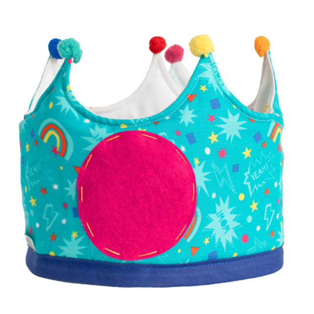 Bonita y divertida corona de cumpleaños reversible. Fabricada en tela de algodón reversible. Elige el lado que más te guste, los personajes del estampado power por un lado, o el estampado turquesa por el otro. Acolchada para mayor comodidad, cierre ajustable de velcro y decorada con unas divertidas borlas a juego. Un bonito regalo que acompañará los cumpleaños año tras año. Incluye una preciosa caja de presentación y un pack de números del 0 al 9.