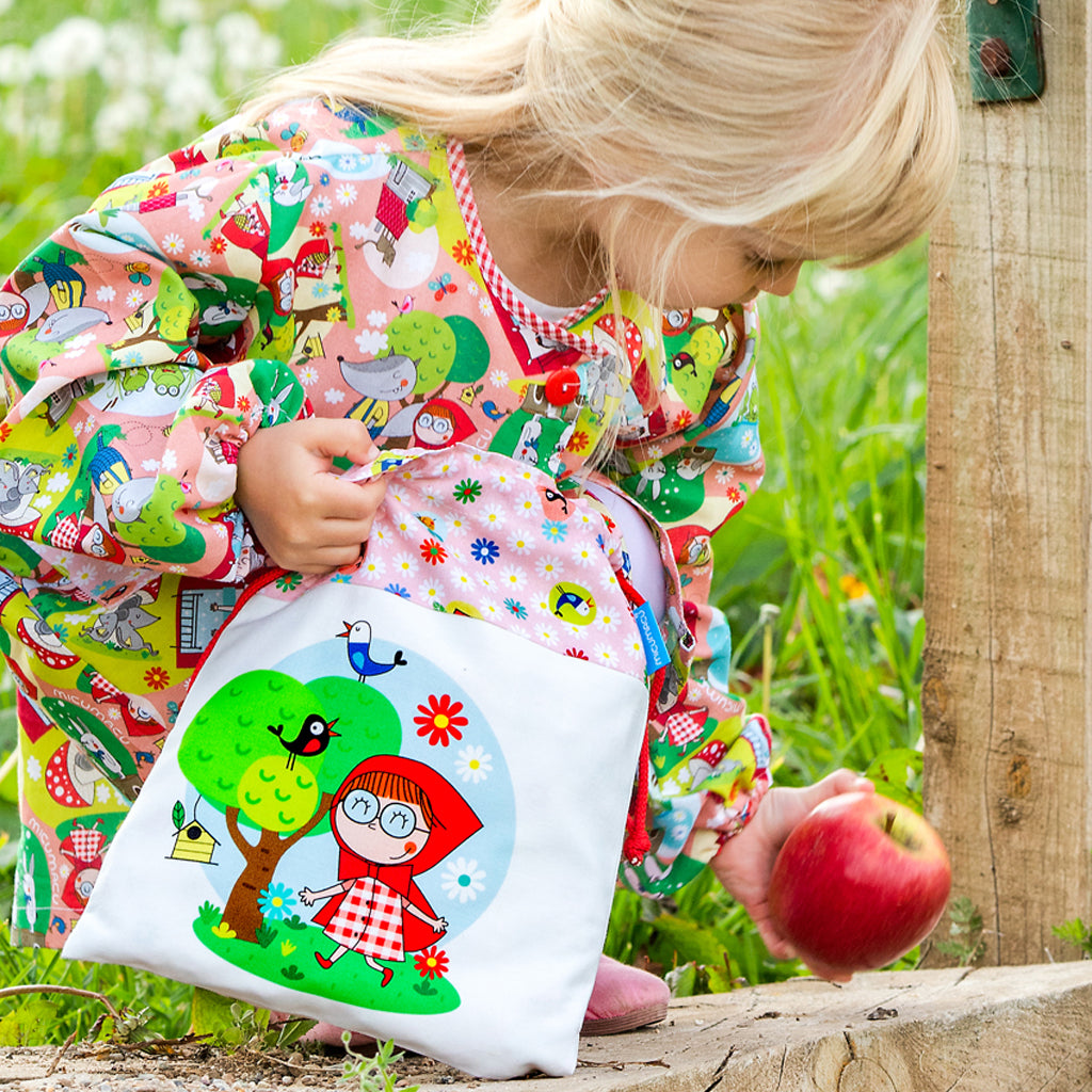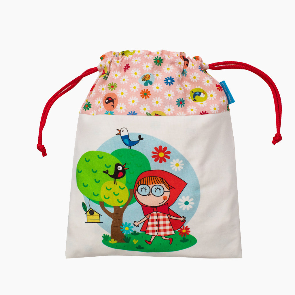 Divertida bolsa merienda multiusos. Es de algodón y tiene nuestro personaje caperucita y estampado de margaritas a juego. Interior con forro.
