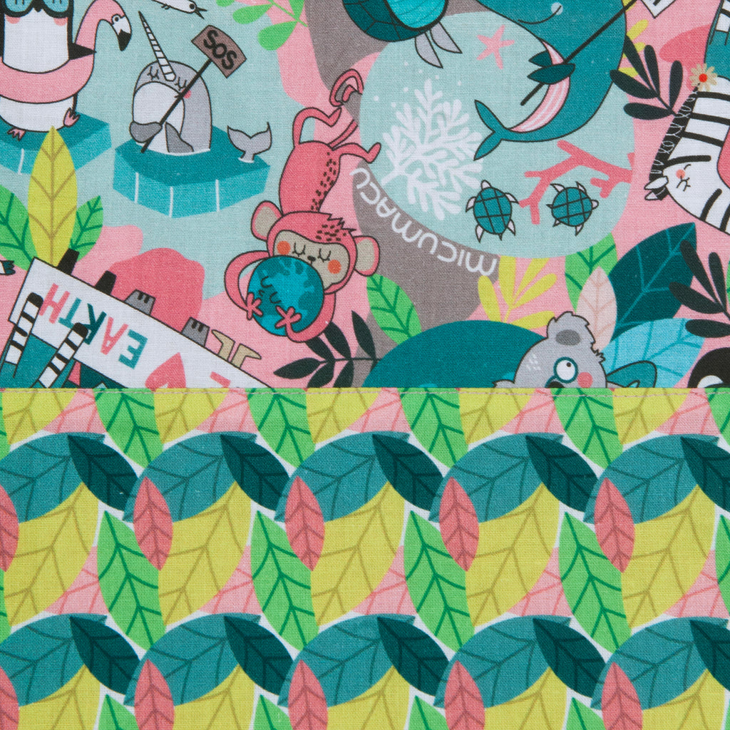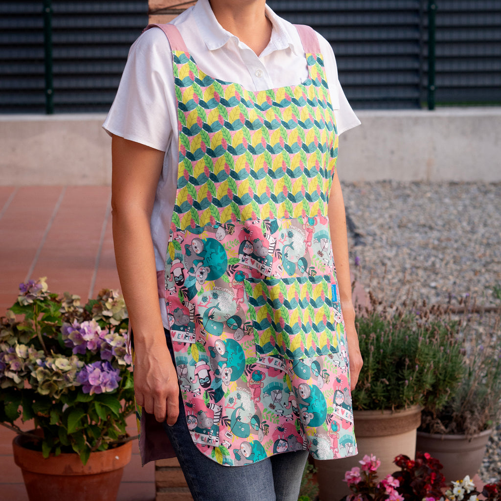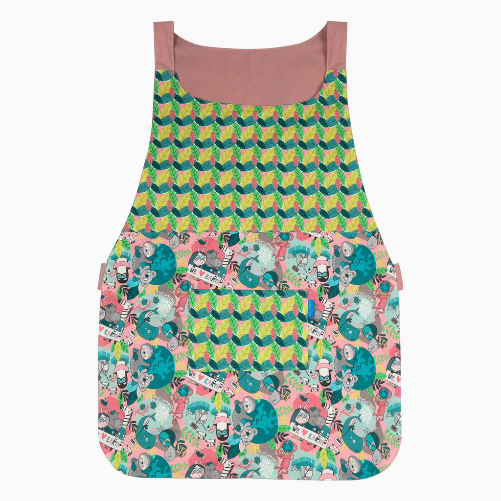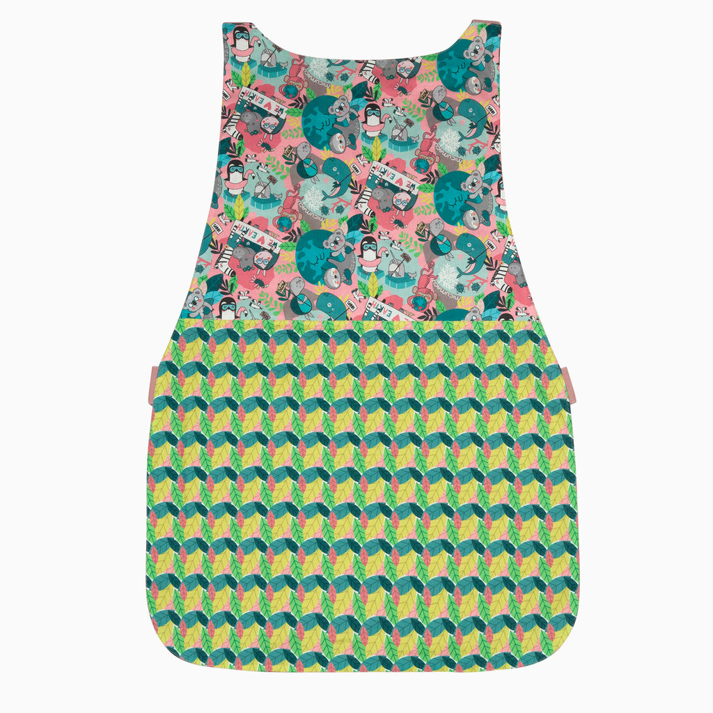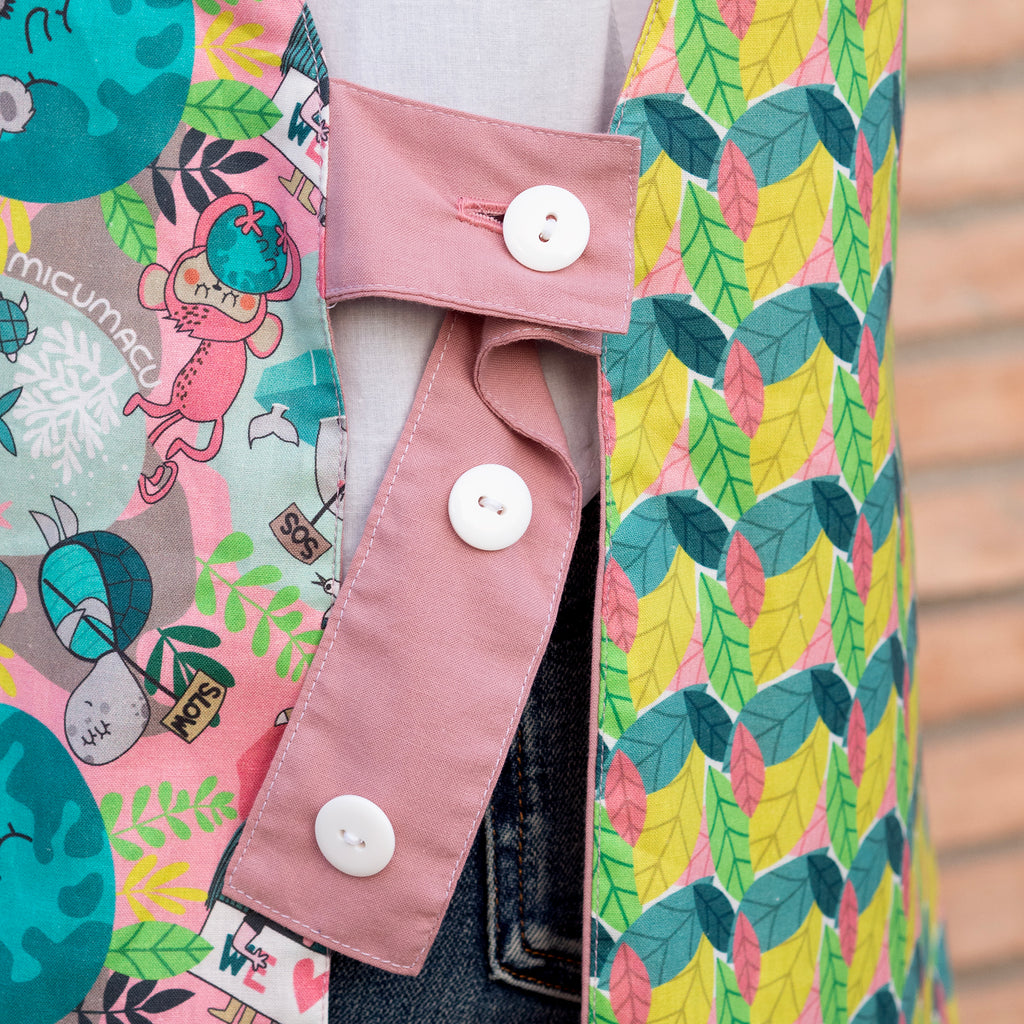 Bonita estola para adultos con nuestro simpático estampado de la Tierra en tonos rosa. Tejido de algodón muy suave, agradable y fresco. Es de talla única y se ajusta mediante una tira de botones laterales. Tiene un bolsillo delantero.