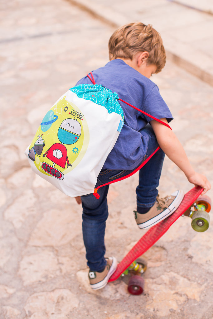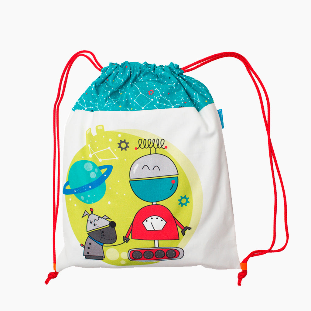 Nuestra mochila de robot te va a encantar para que tus hijos lleven todo lo que necesiten al cole o la guarderia. Fabricada con loneta y dibujo de robot y su inseparable mascota. Es práctica y cómoda y seguro que le vas a sacar provecho porque siempre la llevarás contigo.
