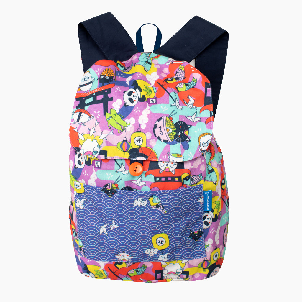Esta mochila con solapa es ideal para ir al cole. Es muy ligera y cómoda. Además, nuestro divertido estampado de Japan lovers con fondo lila hará que ir al cole sea una fantástica aventura. Disponible en dos tamaños.