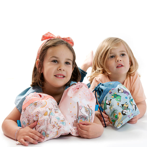 Esta alegre bolsita tiene el tamaño perfecto para llevar la merienda de los niños. Con nuestro estampado de unicornios y la tela de confeti a juego, fabricada en tela de algodón 100% y con forro interior.