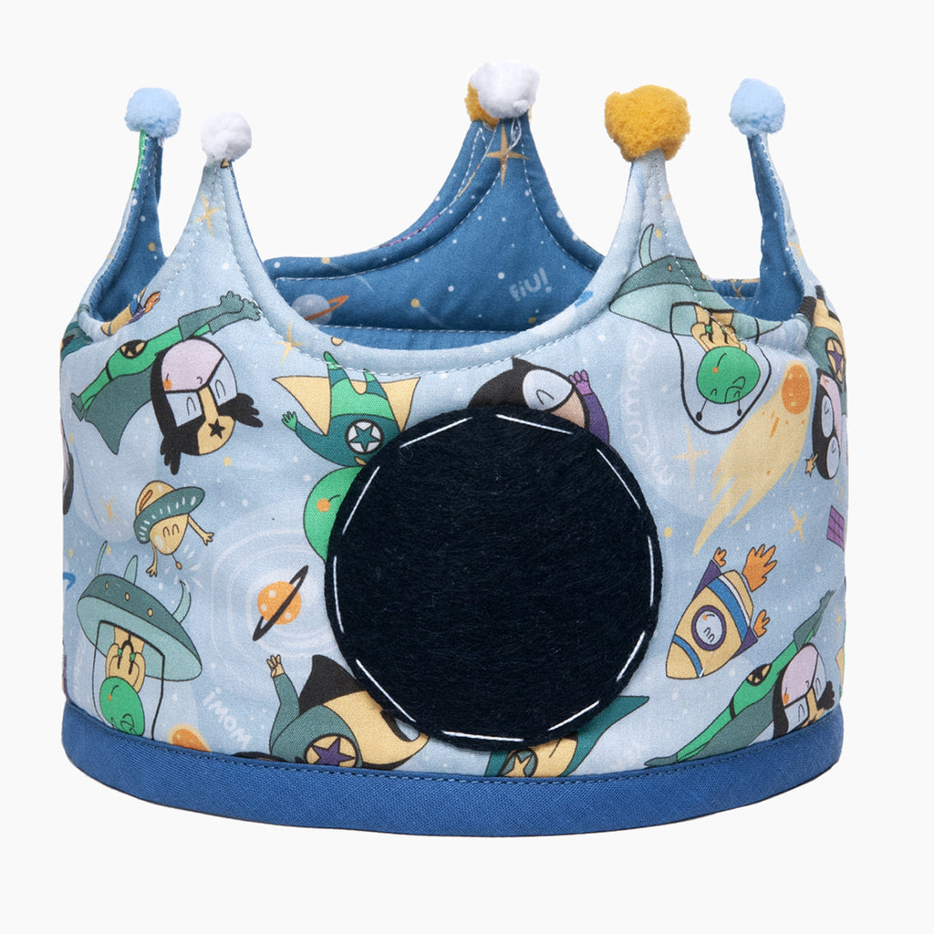 Divertida y cómoda corona de cumpleaños reversible. Fabricada en tela de algodón reversible. Elije que lado te gusta más: el estampado de superhéroes, extraterrestres y naves espaciales, o el universo azul iluminado por estrellas fugaces y planetas fantásticos. Acolchada para mayor comodidad, cierre ajustable de velcro y decorada con unas divertidas borlas a juego. Un bonito regalo que acompañará la celebración año tras año. Incluye una preciosa caja de presentación y un pack de números del 0 al 9.