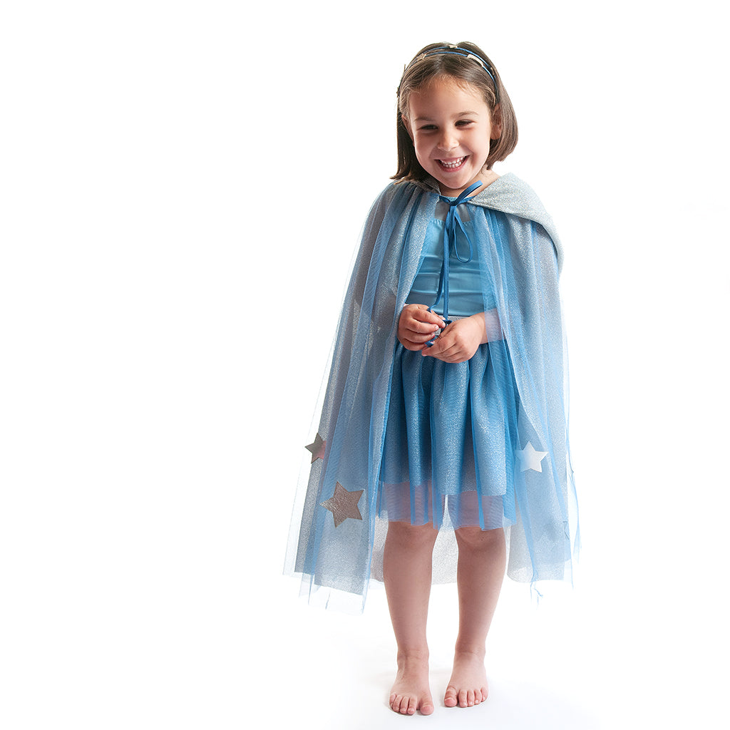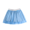Divertida falda de tul azul muy suave y con mucha caída. Está compuesta de una capa inferior un poco más corta en plata brillante y dos capas superiores en tul de color. Con goma en la cintura y lazo en la espalda para acabar de ajustar a la medida. Disponible en talla única. Puedes encontrar la capa a juego.
