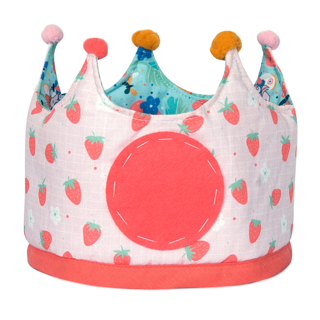 Alegre y cómoda corona de cumpleaños reversible. Fabricada con tela de algodón reversible. Por un lado la primavera en una tela: mariquitas, fresas, flores y ranas sobre un precioso fondo mint. Por el otro un dulce estampado de fresas. Acolchada para mayor comodidad, cierre ajustable de velcro y decorada con unas divertidas borlas a juego. Un bonito regalo que acompañará la celebración año tras año. Incluye una preciosa caja de presentación y un pack de números del 0 al 9.
