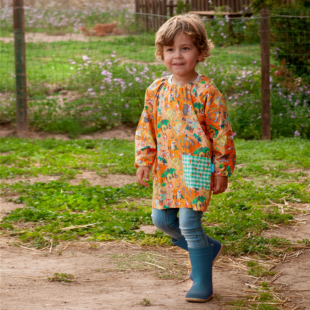 Bata escolar confeccionada con tela de algodón 100%, simpática y divertida para que los más pequeños se lo pasen bomba cada vez que se la pongan. Acabados con goma en cuello y mangas. Se pueden personalizar con el nombre bordado a la altura del pecho. Son cómodas y nuestros personajes de la colección orange slow farm les encantarán... ¡estamos convencidos!
