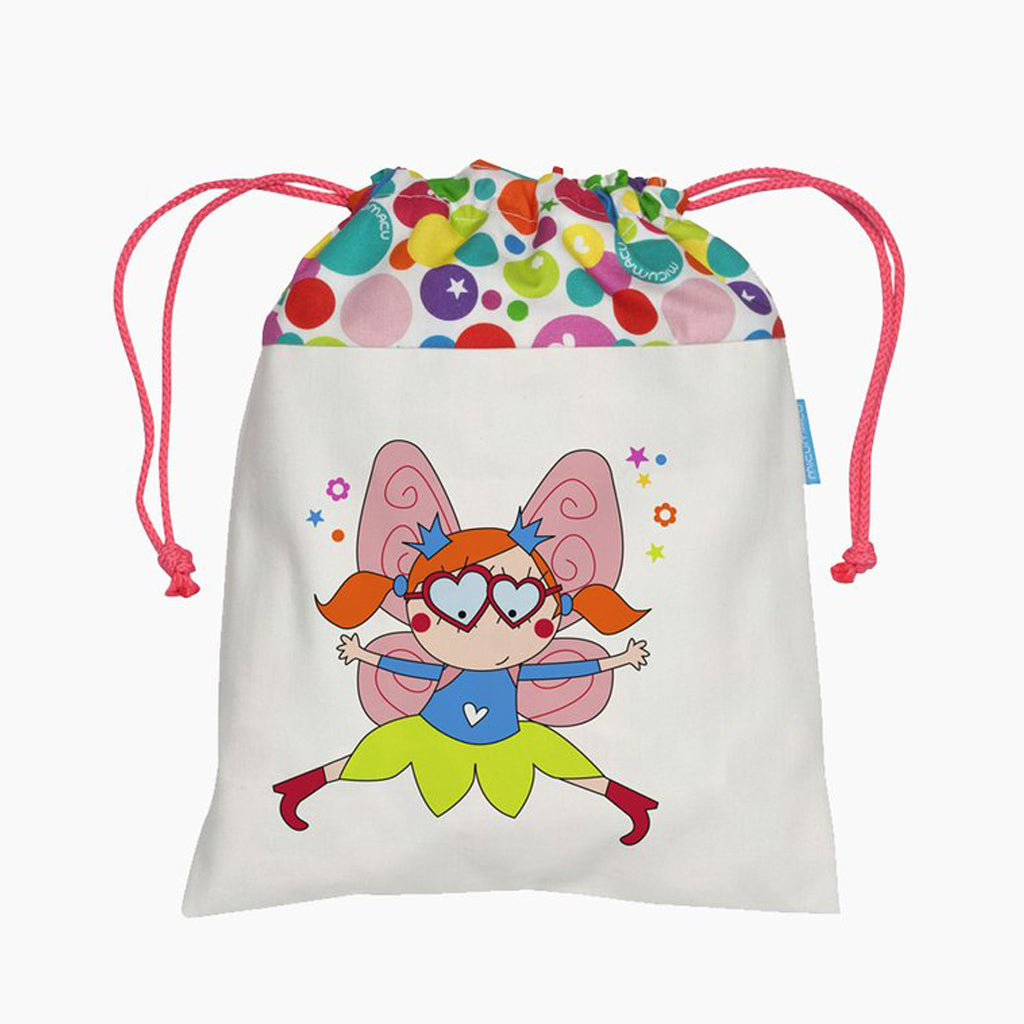 Esta alegre bolsita tiene el tamaño perfecto para llevar la merienda de los niños. Con nuestra divertida hada y sus topos de colores, fabricada con tela de algodón 100% y con forro interior.