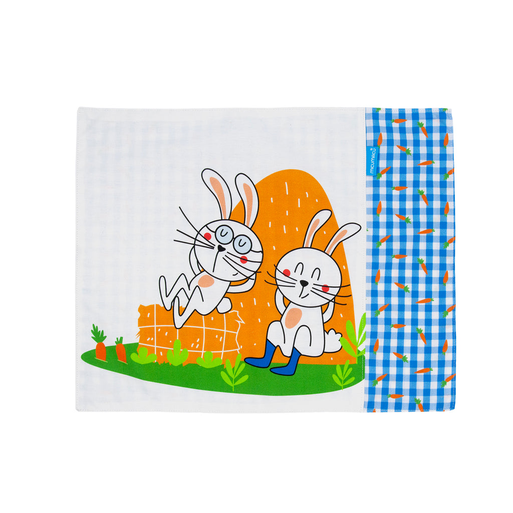 Cómoda servilleta para llevar a la guardería o el cole y utilizarla durante el almuerzo. Está hecha de algodón 100% y tiene a nuestros divertidos hermanos conejo en una cara y cuadros vichy con zanahorias en la otra.