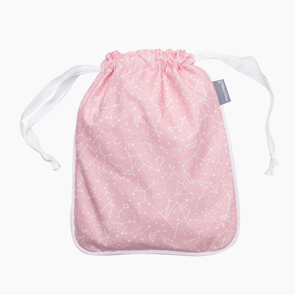 Práctica bolsa con nuestro print Micumacu de constelación pink en tonos pastel que acompañará a tu hija para que disfrute de una original merienda, fabricada en tela de algodón y con forro interior. Práctico cierre con cordón.