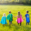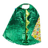 Divertida y cómoda capa de superhéroe de dinosaurio en verde metalizado y crestas acolchadas. Interior con nuestro tejido de huellas de dinosaurio. Utilízala de manera reversible. ¡Tus hijos desarrollaran su imaginación y se lo pasaran en grande!