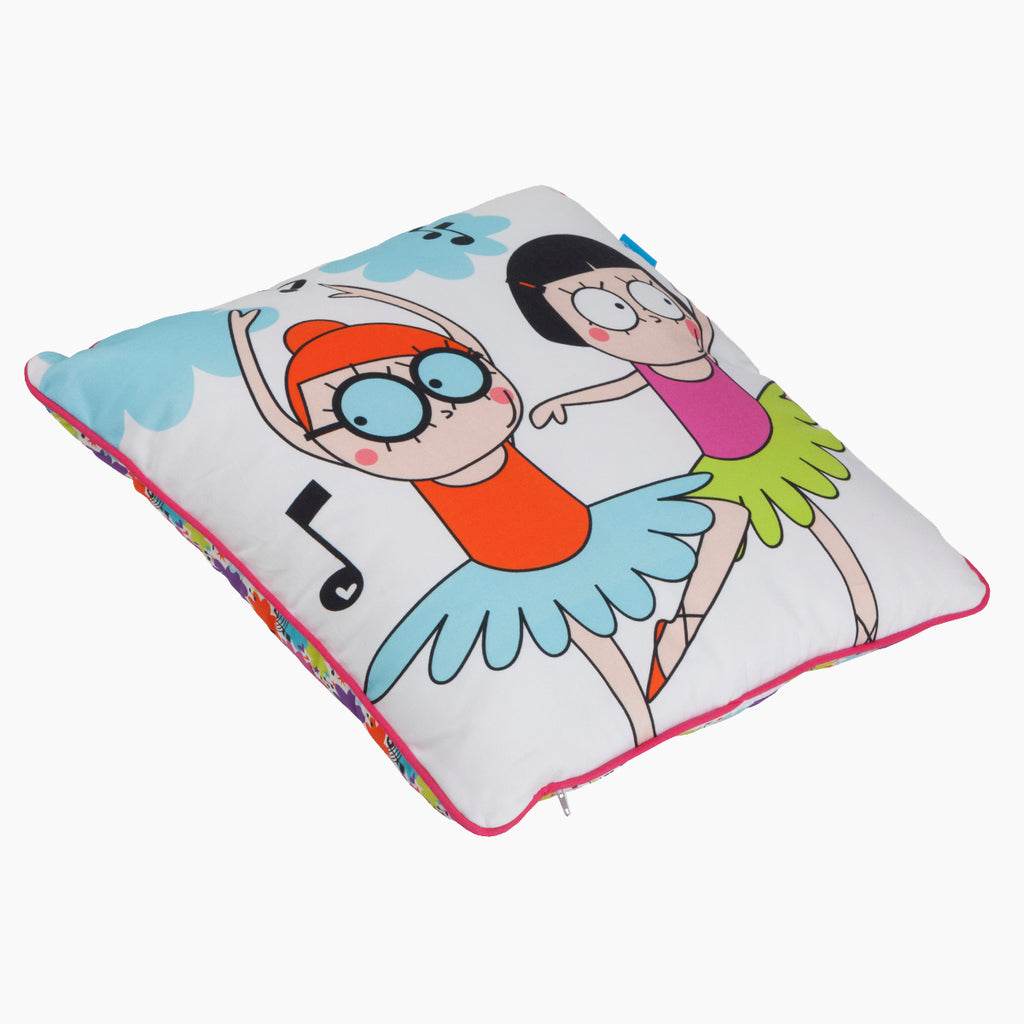 ¡Anda que no tienen ritmo estas bailarinas micumacu! Nuestros cojines son alegres, divertidos y a tu hija le va a encantar porque para estos personajes todo es una fiesta. Es desenfundable para que lo puedas lavar cómodamente y el relleno es blando y agradable.