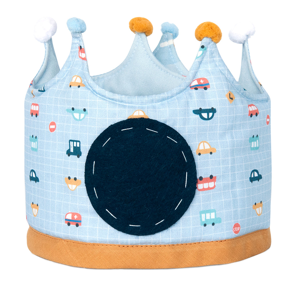 Corona de cumpleaños fabricada en tela de algodón reversible. Por un lado los personajes del estampado traffic jam: Charlie paseando con su bici, Milo en su motocicleta, la familia Scoop camino a la playa y Toby atareado en su ambulancia, por el otro, una suave cuadrícula azul de coches. Acolchada para mayor comodidad, cierre ajustable de velcro y decorada con unas divertidas borlas a juego. Un bonito regalo que acompañará la celebración de cumpleaños año tras año. Incluye una preciosa caja de presentación y un pack de números del 0 al 9.