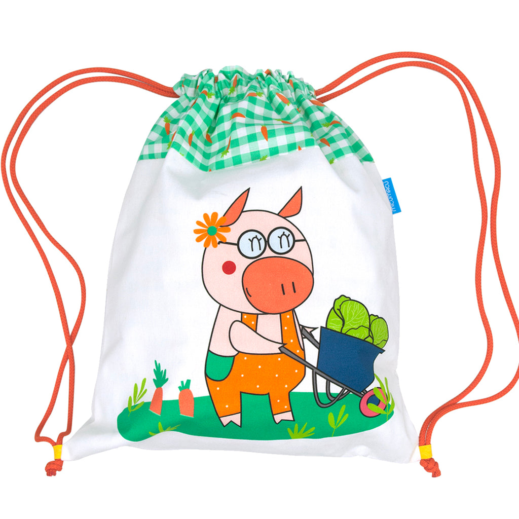 Esta adorable mochila infantil es perfecta para ir al cole o como multiusos, y está hecha de tela con forro interior. Tiene estampada a nuestra alegre cerdita Daisy de la colección orange slow farm.