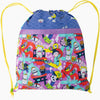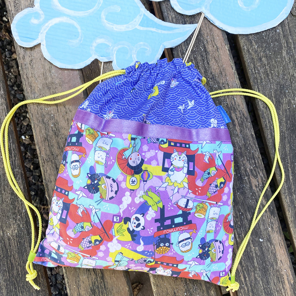Divertida mochila infantil con temática japonesa. De algodón y con forro interior, tiene nuestros divertidos estampados Japan lovers y geometría en tonos azules, con cordones amarillos a conjunto.