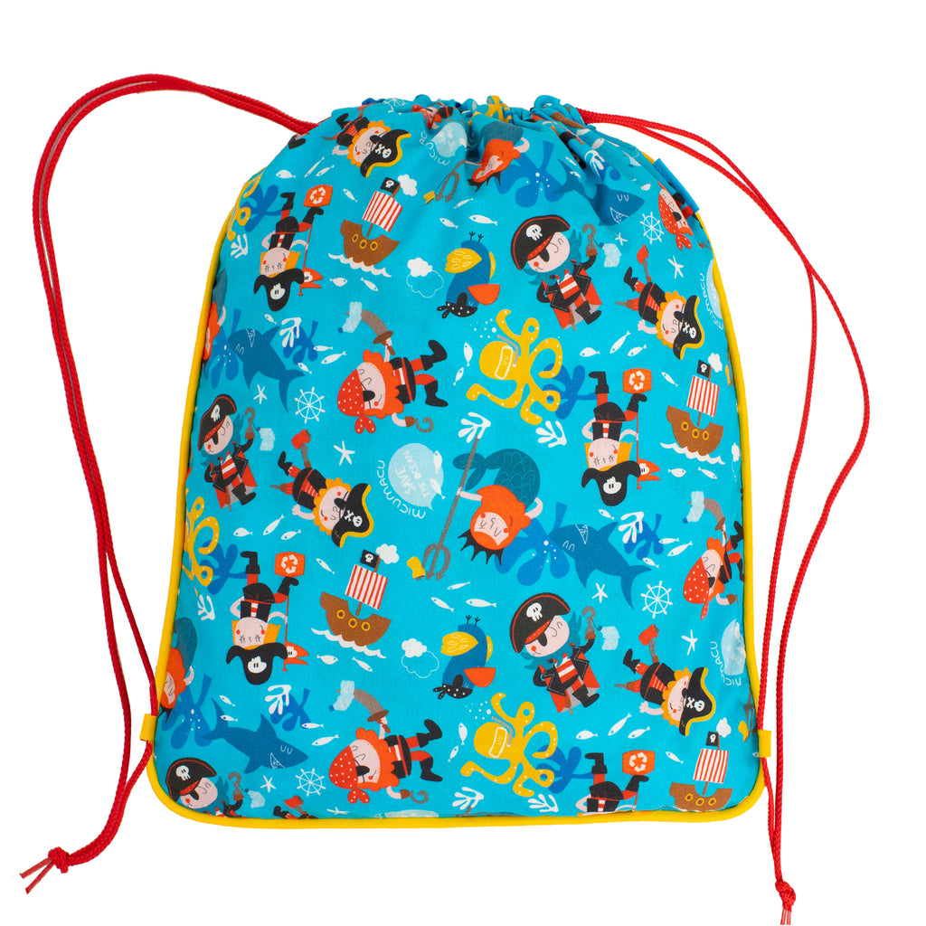 ¡Atención amantes de los piratas!...Divertida mochila infantil con nuestro estampado Ocean. De algodón y con forro interior, con cordones rosa a conjunto.