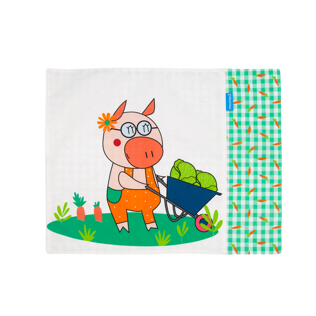 Cómoda servilleta para llevar a la guardería o el cole y utilizarla durante el almuerzo. Está hecha de algodón 100% y tiene a nuestra adorable cerdita Daisy en una cara y símbolos en la otra.